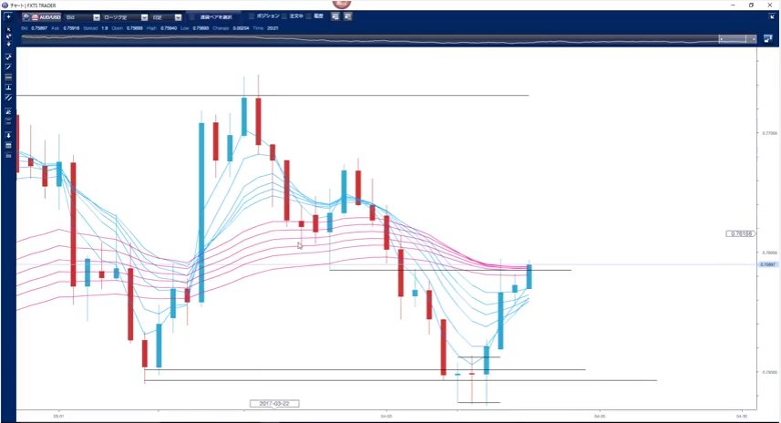 「フォーカス」のユーロドルのレッスンでは、GMMAは収斂した長期線、12日の大陽線内で変化を待つ状態にあるユーロドルですが、今後のシナリオを描くための考え方について学びました。